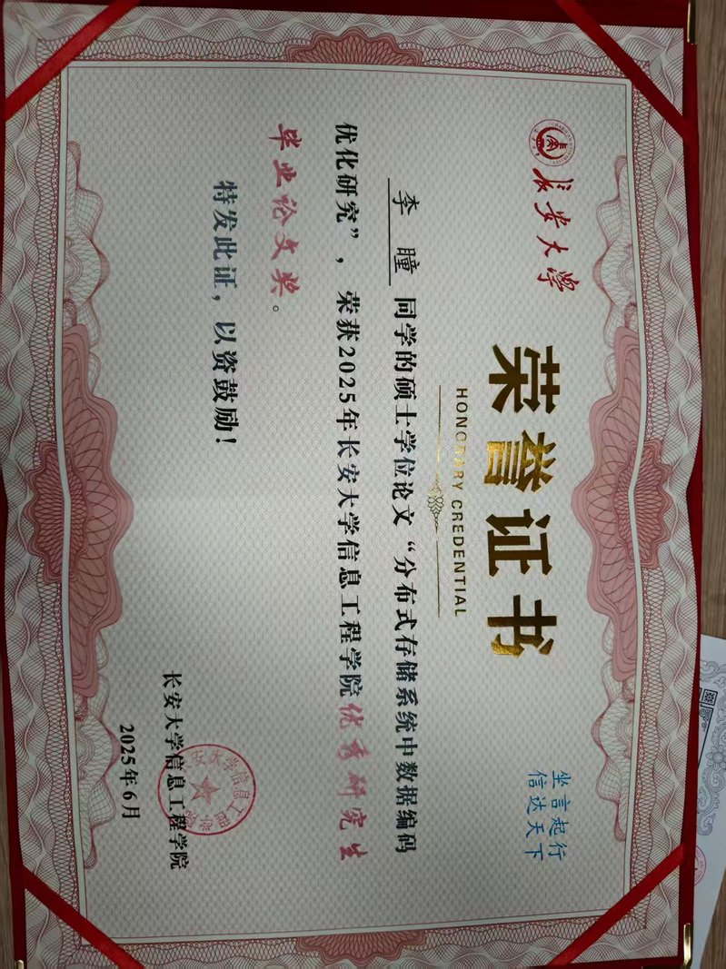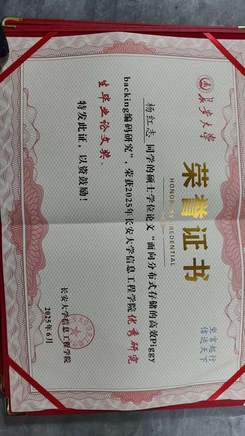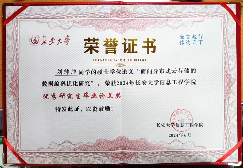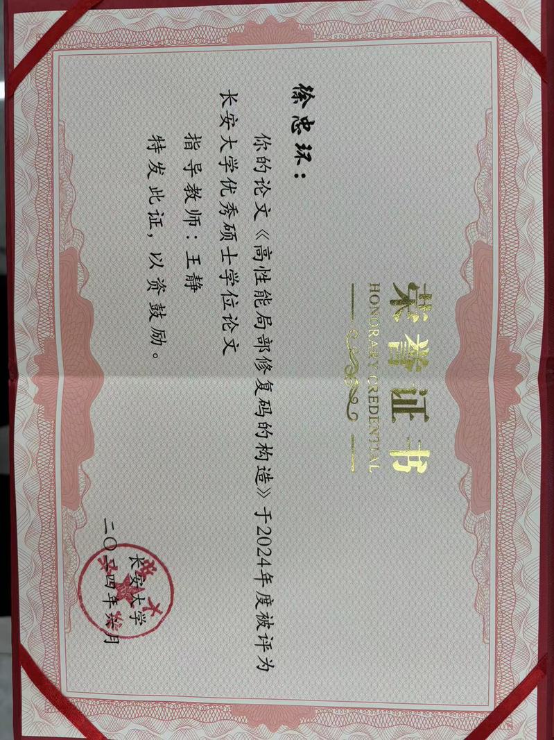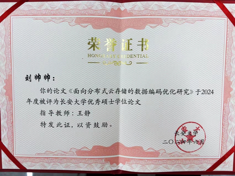 开授课程本科生: (1)双语课程《无线网络技术》 (2)《机器学习基础》 留学生: (1) 《大数据基础》 研究生: (1)《矩阵论》 科研项目主持项目: 1、国家自然科学基金-青年科学基金项目,62001059,2021.01-2023.12,结题; 2、国家自然科学基金专项基金-科学部主任基金,61040005,2011.01-2011.12,结题; 3、陕西省重点研发计划项目-一般项目(工业领域),2021GY-019,2021.01-2022.12,结题; 4、中国博士后科学基金特别资助项目,2012T50789,2012.01-2013.12,结题; 5、中国博士后科学基金面上资助项目,20110491638,2011.01-2012.12,结题; 6、陕西省自然科学基础研究计划-一般项目(青年),2011JQ8036,结题; 7、陕西省自然科学基础研究计划-一般项目(面上),2015JM6307,结题; 8、中央高校基础研究支持计划资助项目,CHD2012ZD005,结题; 9、中央高校基础研究支持计划资助项目,300102248104,结题; 10、中央高校基础研究支持计划资助项目,CHD2009JC063,结题; ...... 参与项目: 1、国家自然科学基金面上项目,62072054,在研; 2、综合业务网理论及关键技术国家重点实验室开放基金项目,ISN12-06,结题; 3、国家863课题,2007AA01Z215,结题; 4、华为高校科技基金资助项目,YJCB2006001RE,结题; 论文部分代表性论文: [1] J. Wang, Y. Ma, T. Yu, K. Yang and X. Liu, Optimal Locally Repairable Codes With Multiple Erasure Tolerance, in IEEE Communications Letters, vol. 29, no. 12, pp. 2845-2849, 2025.(SCI indexed) [2] Jing Wang, Keqin Shen, Xiangyang Liu, and Chunlei Yu, “Construction of Binary Locally Repairable Codes with Optimal Distance and Code Rate”, IEEE Communications Letters, 2021, 25(7): 2109-2113.(SCI indexed) [3] Jing Wang, Zhiyuan Yan, Kuan-Ching Li, Hongmei Xie, Xiangyang Liu, “Local Codes With Cooperative Repair in Distributed Storage of Cyber-Physical-Social Systems”, IEEE Access, 2020, 8: 38622-38632. (SCI indexed) [4] Jing Wang, Shuxia Wang, Tiantian Wang, Xuefei Zhang, “Minimum Bandwidth Regenerating Codes Based on Cyclic VFR Codes” , KSII Transactions on Internet and Information Systems, 2019, 13(7): 3583-3598. (SCI indexed) [5] Tiantian Wang, Jing Wang*, Haipeng Wang, Jie Meng, Chunlei Yu, and Shuxia Wang, “Adaptive-and-Resolvable Fractional Repetition Codes Based on Hypergraph”, KSII Transactions on Internet and Information Systems, 2023, 17(4): 1182-1199. (SCI indexed) [6] Jing Wang, Wei Luo, Wei Liang, Xiangyang Liu, Xiaodai Dong, “Locally Minimum Storage Regenerating Codes in Distributed Cloud Storage Systems”, China Communications, 2017, 14(11): 82-91. (SCI indexed) [7] Jing Wang, Mingsheng Ouyang, Wei Liang, Jun Hou, “Device-to-Device Relay Cooperative Transmission Based on Network Coding”, KSII Transactions on Internet and Information Systems, Vol.11, No.7, 2017. (SCI indexed) [8] Jing Wang, Kaikai Chi, Yang Yang and Xinmei Wang, “Network coding based on hyper-edge decomposition for wireless network with link failures”, International Journal of Communication Systems, Vol.28, No.7, pp.1387-1399, 2015. (SCI indexed) [9] Jing Wang, Xiangyang Liu, Kaikai Chi and Xiangmo Zhao, “Complex field network-coded cooperation based on multi-user detection in wireless networks,” Journal of Systems Engineering and Electronics, Vol.24, No.2, 2013.(SCI indexed) [10] J. Wang, K. Chi and X. Wang, “Network Coding-Based Reliable Broadcast Transmission in Wireless Networks,” China Communications, Vol.7, No.2, 2010, pp71-77. (SCI indexed) [11] Jing Wang, Jingmei Liu, Ying Li, Xinmei Wang, “Construction of Codes in Multicast Network with Link Failure”, Journal of Computational Information Systems, Vol.4, No.5, 2008, pp2173-2178. (EIindexed) [12] 王静,李静辉,杨佳蓉,王娥,“三角形结合方案的最优局部修复码构造”,上海交通大学学报,Vol.58, No.1, 2024, pp13-22. (EI indexed) [13] 王静,徐忠环,刘帅帅,刘哲,“可用性不等的全符号局部修复码构造”,哈尔滨工业大学学报,https://link.cnki.net/urlid/23.1235.T.20231226.1508.002,网络首发. (EI indexed) [14] 王静,李静辉,杨佳蓉,王娥,“基于RBIBD的最优局部修复码构造”,电子科技大学学报,Vol.52, No.3, 2023, pp366-371. (EI检索) [15] 王静,何亚锦,雷珂,刘向阳,“基于差集矩阵的部分重复码构造”,电子与信息学报,Vol.44, No.11, 2022, pp4025-4033. (EI检索) [16] 王静,孙伟,何亚锦,沈克勤,张鑫楠,刘向阳,“基于Hadamard矩阵构造部分重复码”,电子科技大学学报,Vol.50, No.2, 2021, pp173-179. (EI检索) [17] 王静,刘艳,余春雷,王秘,刘向阳,“非均匀故障保护的分组修复码构造”,北京邮电大学学报,2019,42(5): 75-82. (EI检索) [18] 王静,梁伟,刘向阳,杨洋,“云存储系统中基于MSR 码的局部性修复编码”,北京邮电大学学报,2016, 39(4): 60-66. (EI检索) [19] 王静,欧阳明生,焦琴琴,罗威,王新梅,“基于网络编码的D2D 干扰消除算法”,系统工程与电子技术,2016, 38(6): 1429-1434. (EI检索) ...... *通信作者 部分发明专利 [1] 王静,沈克勤,孙伟,张鑫楠,何亚锦,基于立方体网络的部分重复码构造和故障节点修复方法,ZL 202110556267.9, 2021.05; [2] 王静,雷珂,王相隆,田松涛,基于迭代矩阵的部分重复码的构造方法及节点修复方法,202111459097.9,2021.12; [3] 王静,杨佳蓉,王娥,李静辉,基于完备循环差集的局部修复码构造及故障节点修复方法,202211217665.9,2022.09; [4] 王静,徐忠环,刘肖悦,刘帅帅,刘哲,可用性不等的全符号局部修复码构造及故障节点修复方法,202310745620.7,2023.06; [5] 王静,徐忠环,刘帅帅,刘哲,段一祥,低修复带宽的局部修复码构造方法及故障节点修复方法,202410050785.7,2024.01; [6] 王静,余春雷,刘艳,王秘,一种基于哈夫曼树的异构部分重复码的构造方法,ZL 201910204203.5,2019.03; [7] 王静,王秘,余春雷,刘艳,基于完全