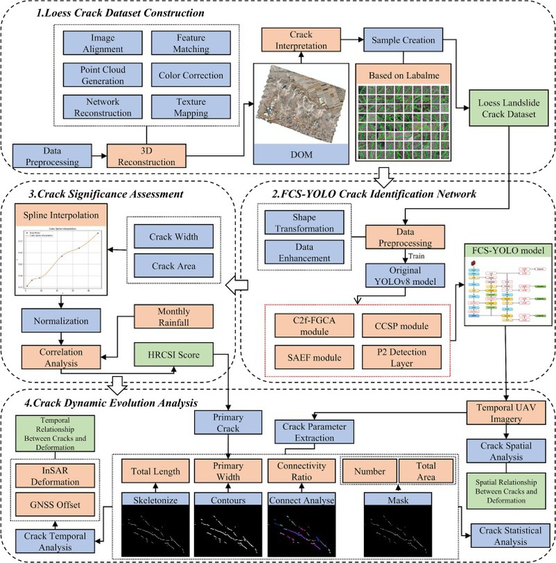 Pengxiang Zhou, Mingtao Ding*, Qiang Xue, Ying Dong, Zhenhong Li.Spatial-temporal evolution of landslide cracks revealed by UAV photogrammetry: The FCS-YOLO model for precise crack extraction under complex backgrounds, International Journal of Applied Earth Observation and Geoinformation, 2026, https://www.sciencedirect.com/science/article/pii/S1569843226002190
