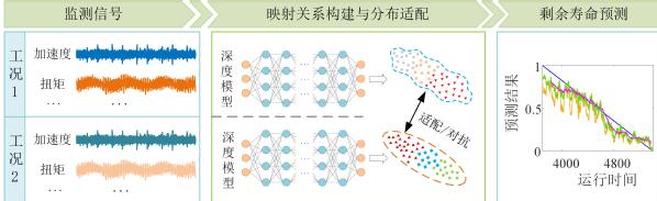 研究内容二:剩余寿命预测 剩余寿命预测通过对机械装备在实际工况下的运行数据进行分析,预估设备从当前状态到失效所需的时间。工程实际中,机械装备常面临复杂时变工况,这使得监测数据存在时变性和不确定性,从而导致退化特征分布差异。如何克服时变工况导致的退化特征分布差异,构建监测信号与剩余寿命的准确映射关系,是智能运维的核心环节。 研究方法涵盖:深度学习神经网络、迁移学习、数字孪生等。